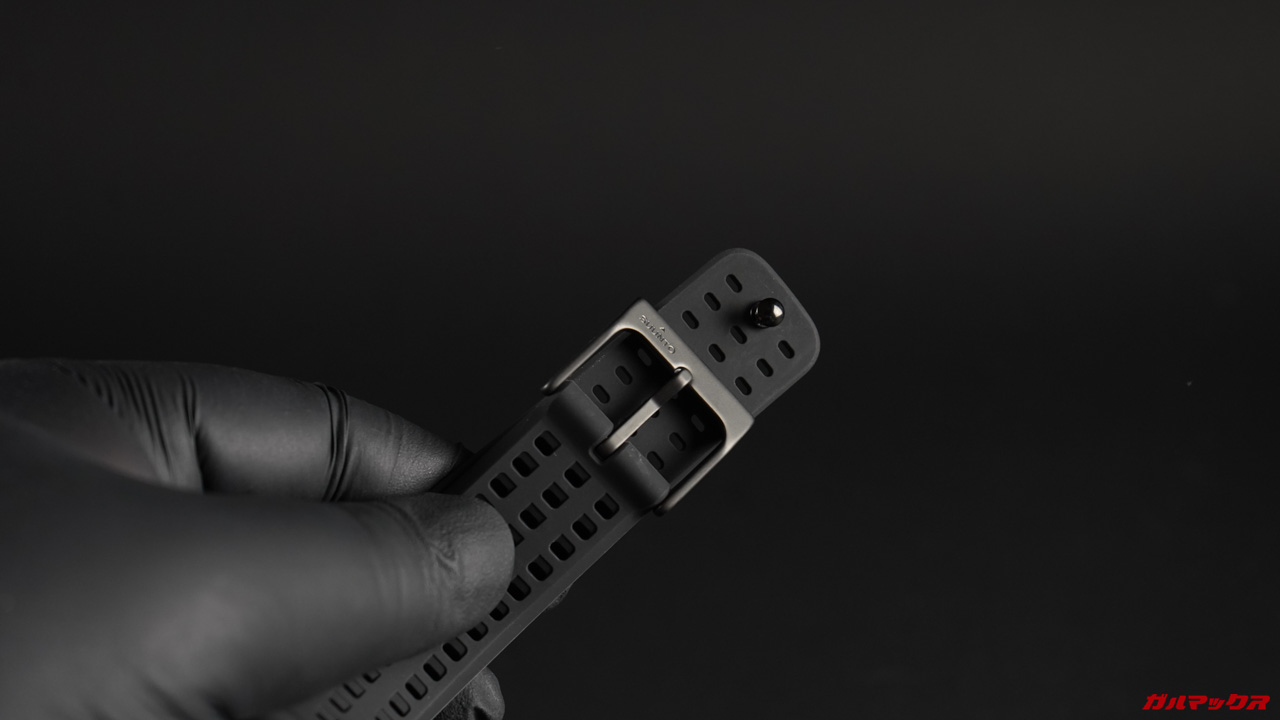 ▼ベルトはバックルに通すタイプでした。ベルトの端はピンがついていてベルトの穴に押し込むことでガッチリと固定されます。激しい動きのスポーツでも安心。↓