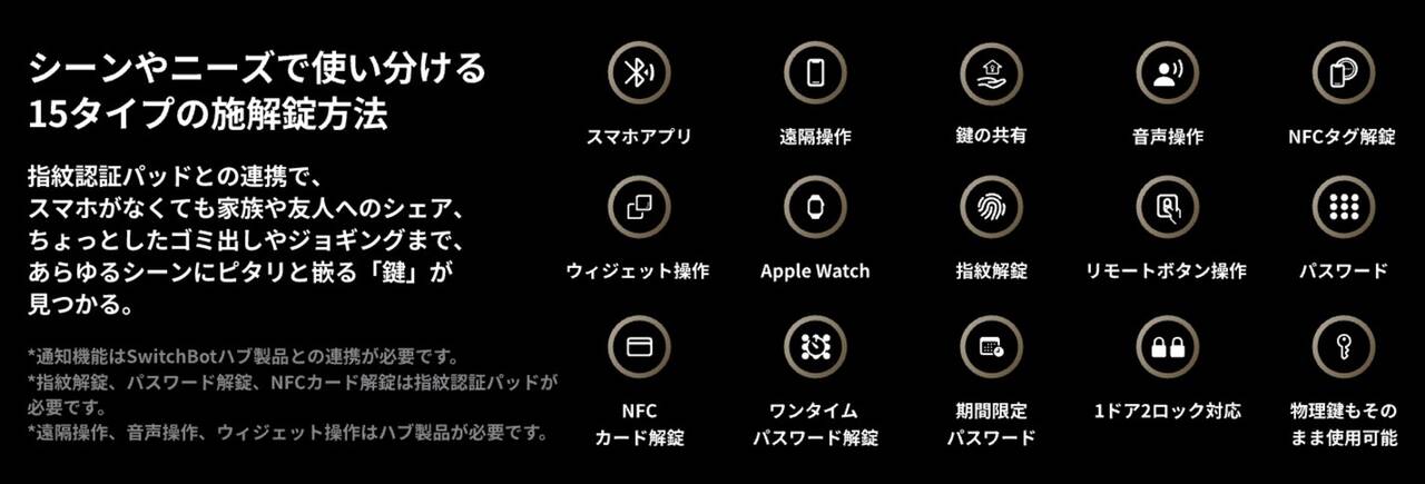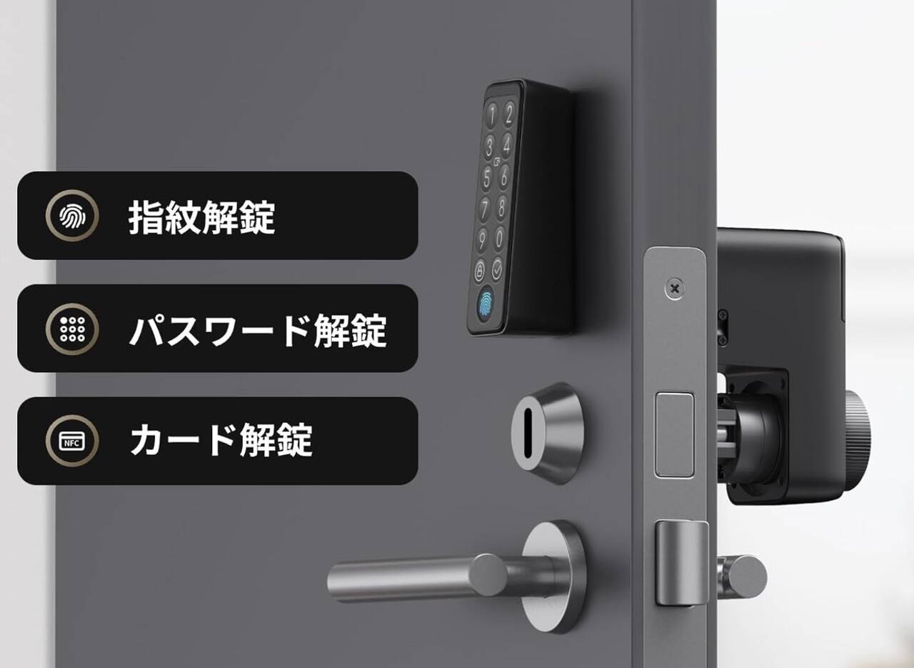 ▼ロック解除も指紋やパスワード、カード(次に紹介するスマートトラッカーカード)など15種類の方法で行えます。もちろんこれまで使ってきた物理鍵も使えるので安心。↓