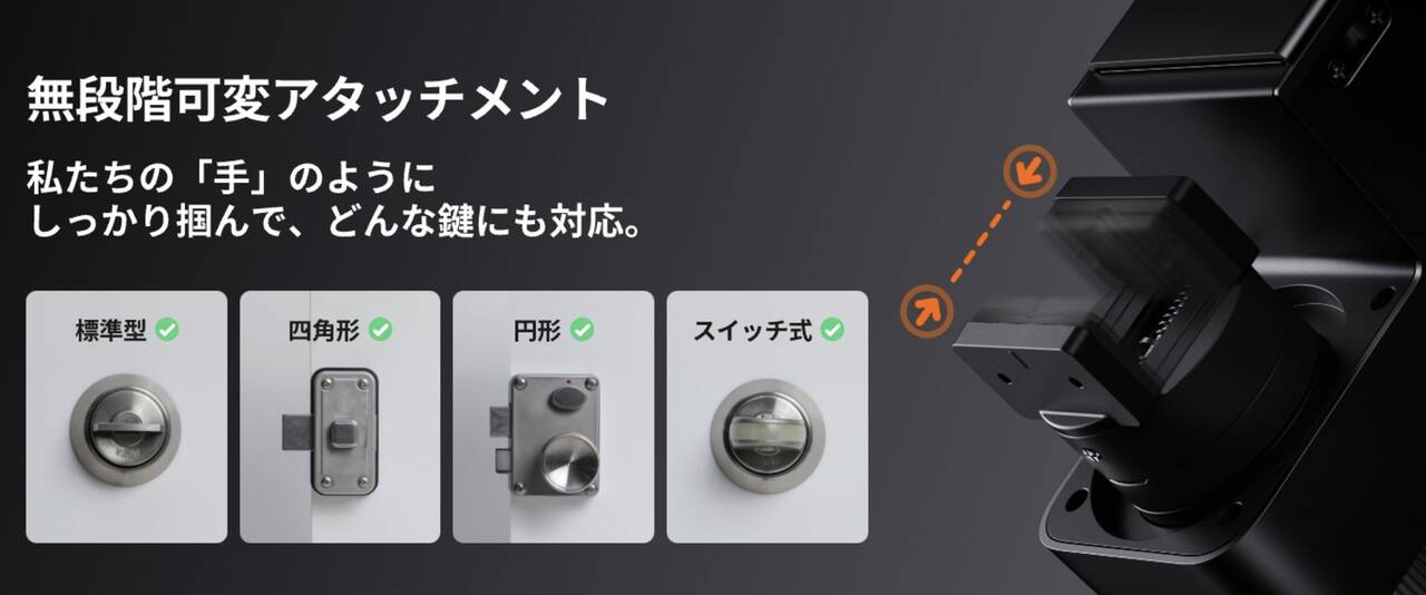 ▼本機はサムターンに対応する後付型のスマートロック。無段階可変アタッチメントにより99%のサムターンに対応していますよ!↓