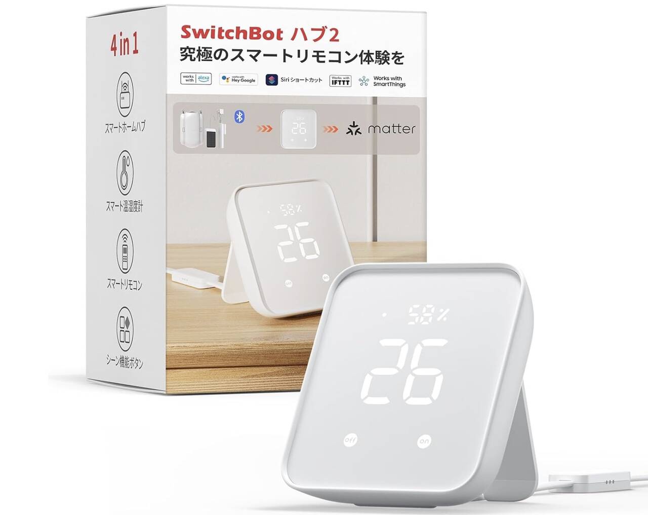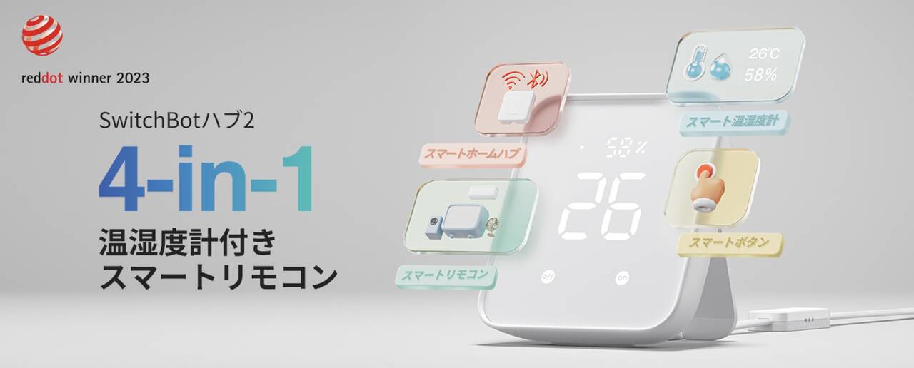 ▼SwitchBot ハブ2はスマートホームハブ、スマート温湿度計、スマートボタン、スマートリコモンの4つの機能を搭載しているのがウリ。↓