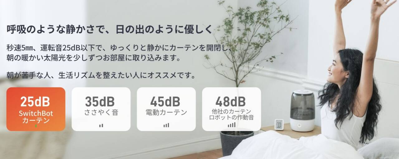 ▼電動カーテンって駆動音が気になる場合もあるんですが、本機は25dBの静音設計なのもポイント。↓