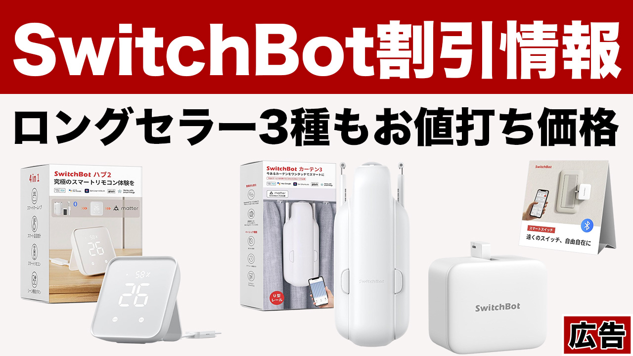 Amazonでブラックフライデー2024が始まりましたが、SwitchBotのロングセラー商品「SwitchBot ハブ2」「SwitchBot カーテン3」「SwitchBot ボット」の3モデルが割引になってますよ!