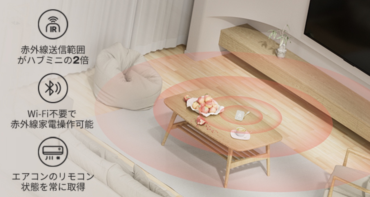 ▼赤外線で操作する製品って非常に多いですが、遠くまで電波が届くようハブミニの2倍の赤外線送信範囲となっているのもポイント。↓