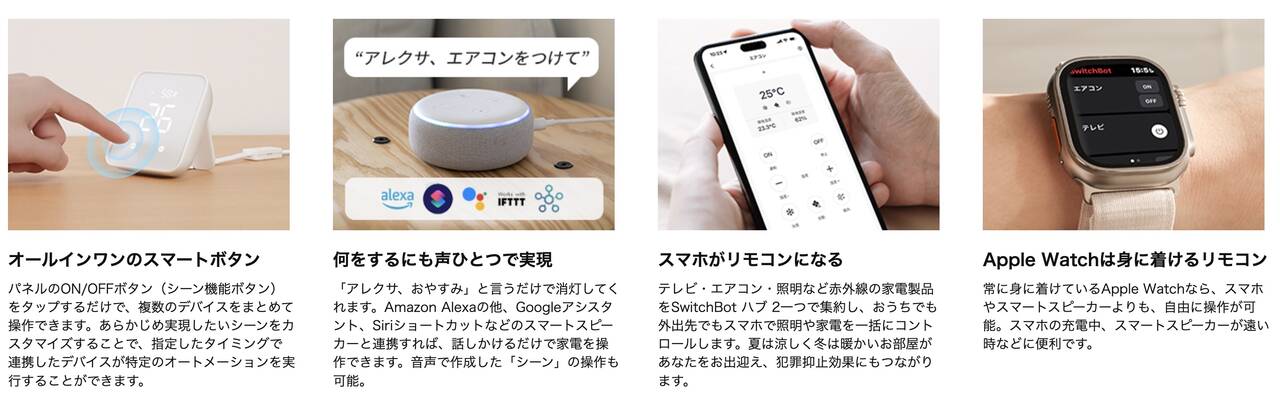 ▼ネットワークに接続している状態であれば本体のボタン操作による一括操作、アレクサでの音声操作、スマホを使った操作、Apple Watchでの操作など多彩なコントロールスタイルで使えるのも◎。↓
