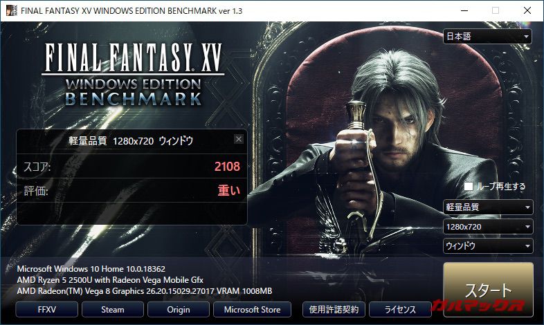 ▼まずは「FINAL FANTASY XV WINDOWS EDITION ベンチマーク」!1280×720の軽量設定で「重い」という結果に。↓