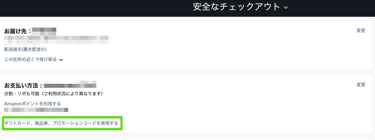 ▼続いてレジ画面で②ガルマックスのクーポンを適用します。まずは「ギフトカード、商品券、プロモーションコードを使用する」をクリック!↓