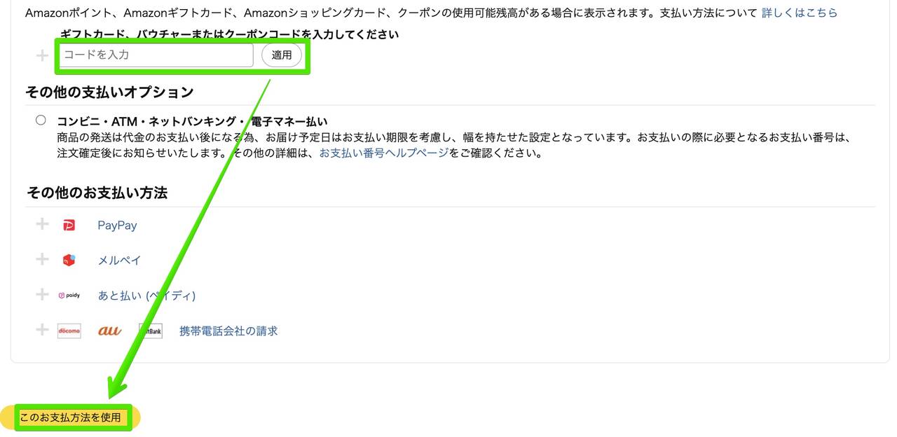 ▼「コードを入力」にクーポン「OXTXWU4S」を入力して「適用」を押してから「このお支払い方法を使用」をクリック!↓