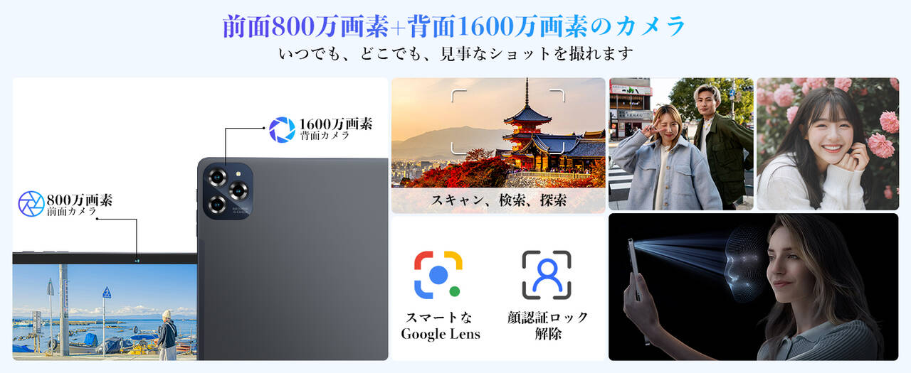 ▼カメラはアウトカメラが1,600万画素、インカメラが800万画素。カメラを用いた簡易的なタイプですが顔認証にも対応しているのは嬉しいポイント。↓
