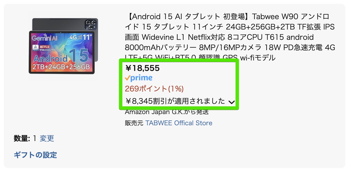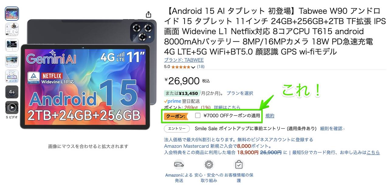 ▼まずはTabwee W90の販売ページへ移動しましょう。①Amazonのクーポン(7,000円オフ)が表示されているので、必ずチェックを入れてからカートに入れてレジに進みましょう。↓