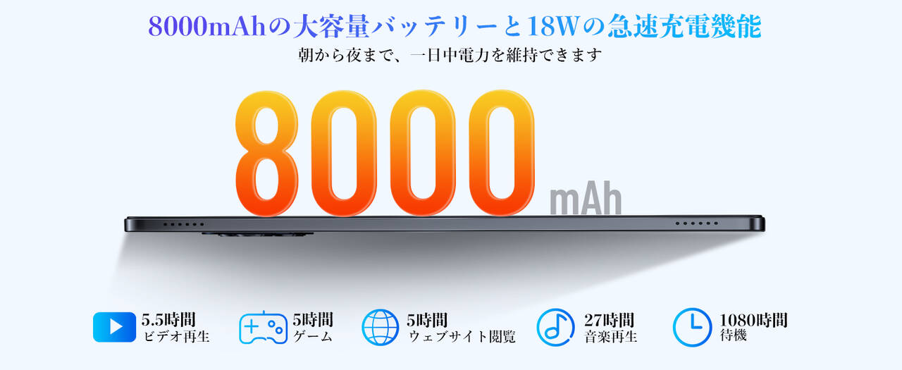 ▼バッテリー容量は8,000mAhで18W充電にも対応。バッテリー仕様はまあお値段なりといったところです。↓