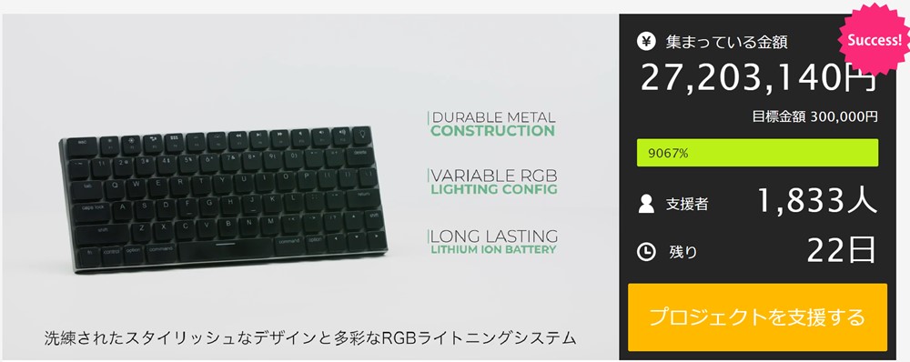 まず、安心していただきたいのが、既にTaptekは目標額300,000円に対して執筆時点で1,823名から9020%を超える27,089,340円の支援金が集まっており目標は既に達成済み!なので支援すると確実にTaptekが手元に届きます!