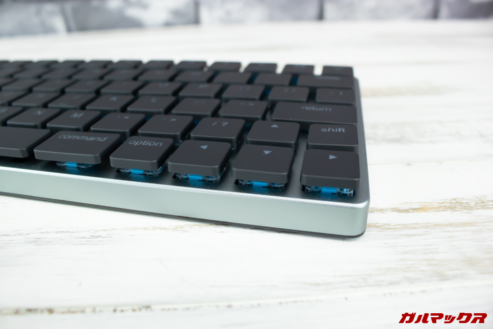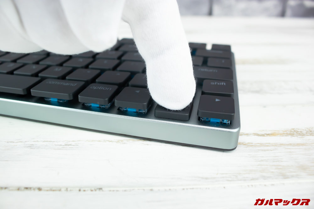 しかしながら青軸メカニカルキーボード特有の「一定圧力でストンと落ちる感触」と「青軸らしい跳ね返り感」を感じる事ができるんです。一般的な青軸メカニカルキーよりも沈み込みと反応位置は浅いですし、打鍵音も僕が聞き慣れている青軸の様なガチャガチャ音がしないんですが、残っているんですよ。しかり青軸感が。