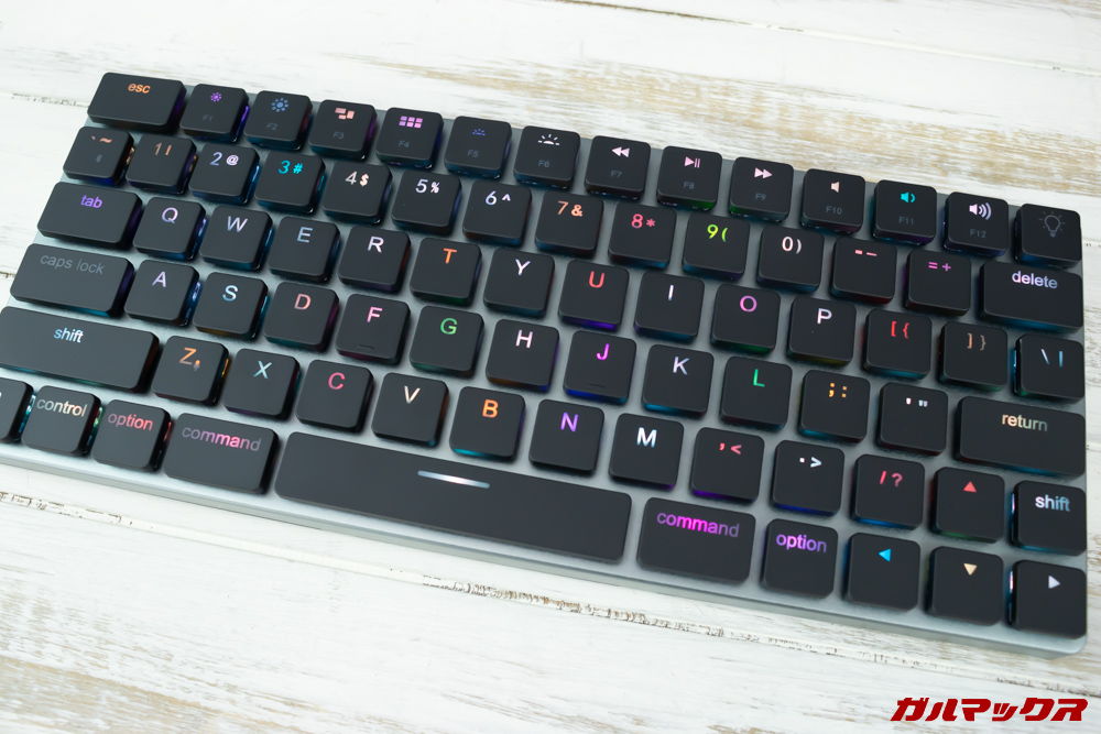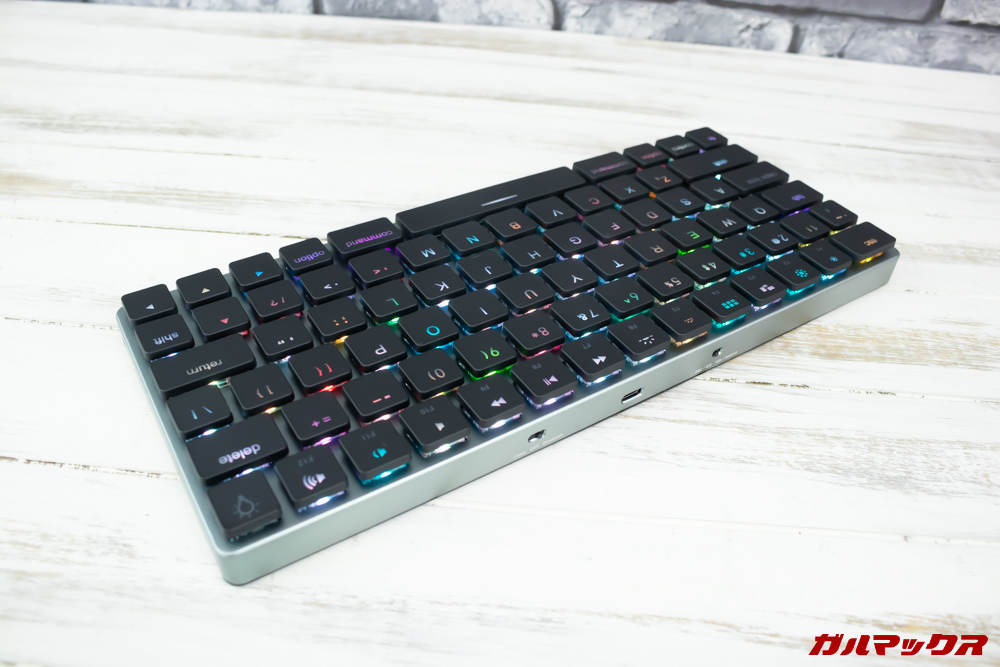 こればっかりは実際に生の音を聞いたほうが良いかも知れません。青軸を採用しているんですが、打鍵音は皆さんが想像している様なガチャガチャ音ではなく、小気味よくカチッっと小さくなっている事が分かるはず。冒頭の動画で3分20秒ごろに一般的な青軸メカニカルキーボードとの打鍵音の違いを収録しているのでチェックしてみて下さいね!