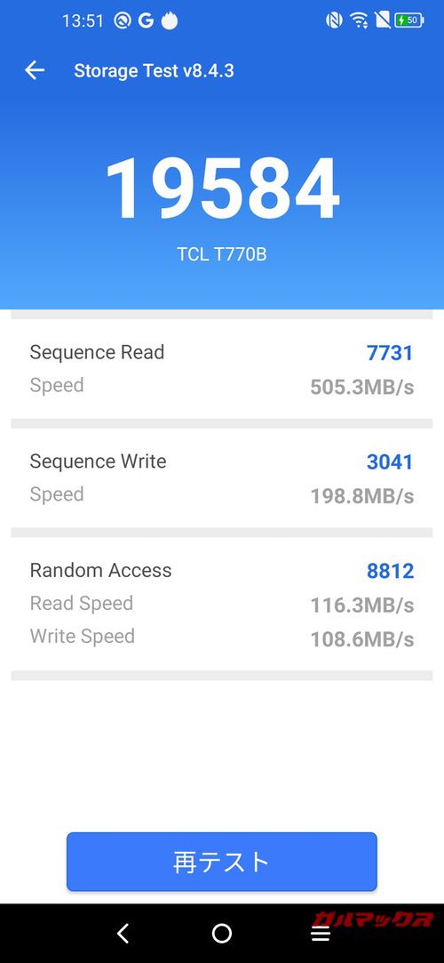 ▼ストレージ速度は読み込みが505.3MB/sあるのでソコソコ速い。普段使いでは十分。書き込みは198.8MB/sで価格なり。↓