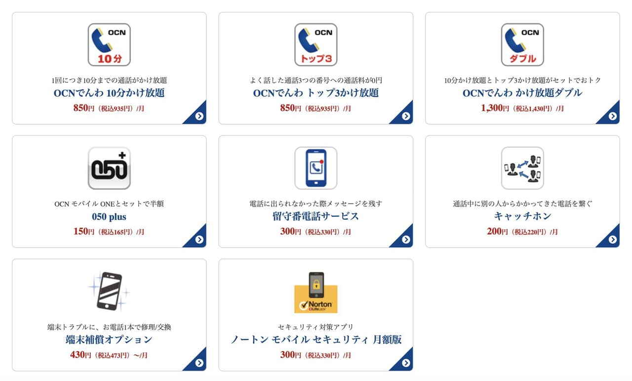 ▼その他、様々なオプションサービスも別途加入可能です。格安SIMでは長めの10分かけ放題を選べるのも見逃せないポイントです。↓