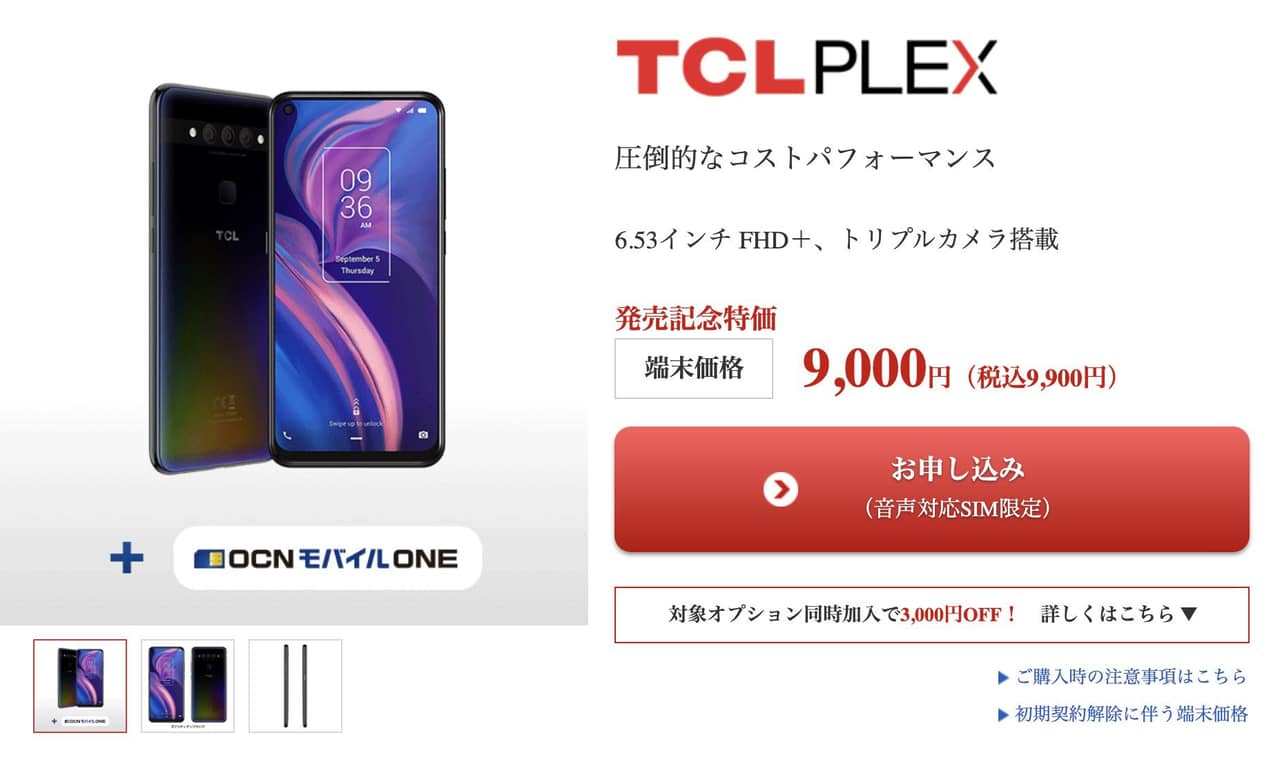 大前提としてOCNモバイルONEのSIM(ドコモ回線の格安SIM)とセットなので回線込みの話なんですが、最新スマートフォンのTCL PLEXが9,000円(税込9,900円)で放出されています。さらに指定オプション加入なら3,000円オフの追加割引が発動して端末代金6,000円も狙えちゃいます。