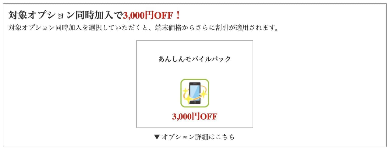 ▼それ以外に「セキュリティー」「ストレージ」「サポート」の3点がセットの【あんしんモバイルパック(月額640円)】のオプション加入で端末代金がさらに3,000円オフとなり6,000円で手に入ってしまいます。↓