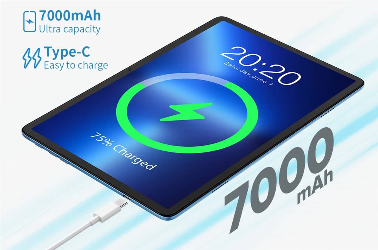▼バッテリー容量は7,000mAhとたっぷりサイズ!動画視聴では最大10時間の電池持ちだそうです!また充電端子もUSB Type-Cでスマホの充電器が使えるのもGood。ただし急速充電の表記はありません。↓