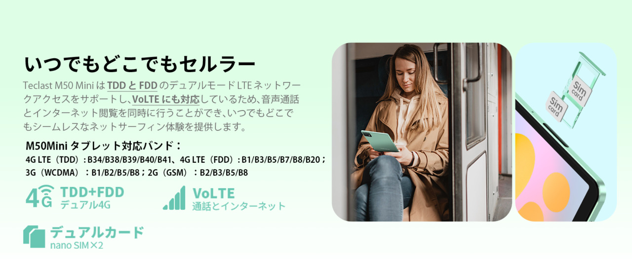 ▼そしてこのTeclast M50 Mini、なんとSIM対応!これまた筆者的にはナイスすぎる部分です。外出先でもデータ通信ができるってのが魅力。どこでもサクッとYoutube見られるしKindleで新しい本を漁ったりWEBをじっくり眺めたい方にぜひとも。↓