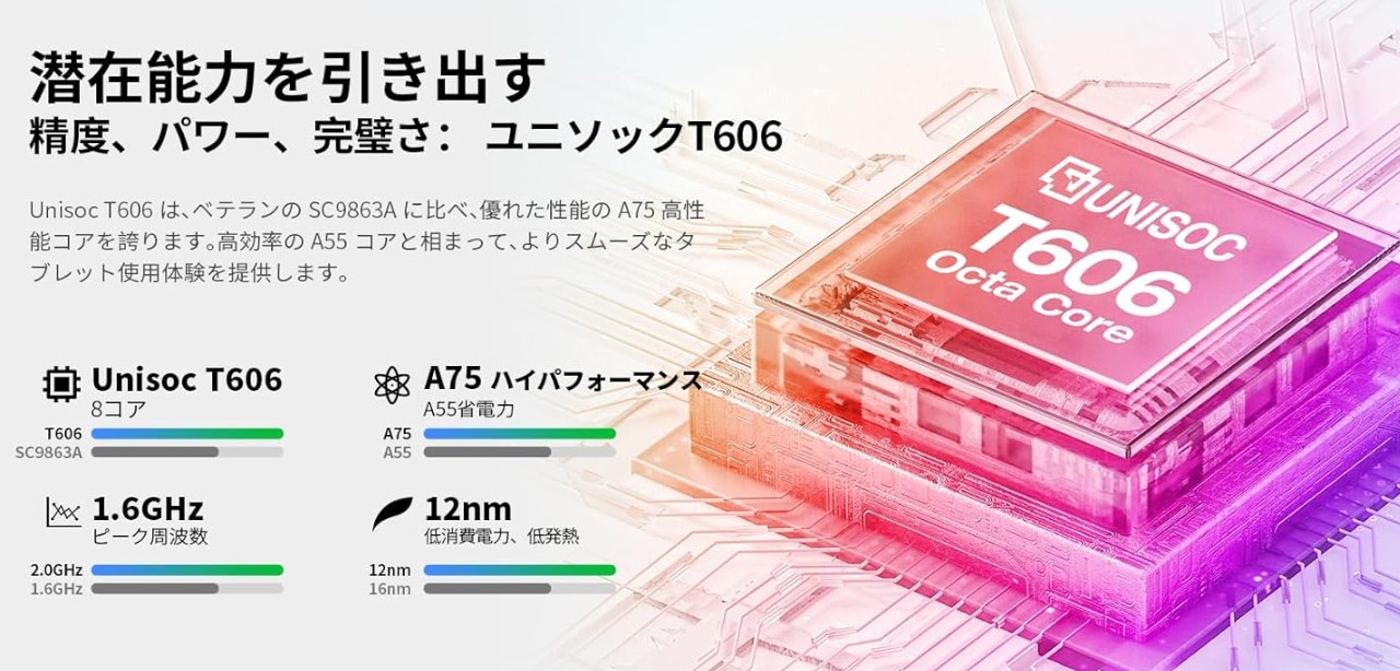 ▼SoCはUNISOC T606を搭載。AnTuTu参考値は22~24万点クラスとなるミドルレンジレベルのチップセットとなり普段使い向けの性能帯となります。動画や電子書籍あたりの使用なら問題なく使えますがゲームや編集アプリなどはカクつき不得手。↓