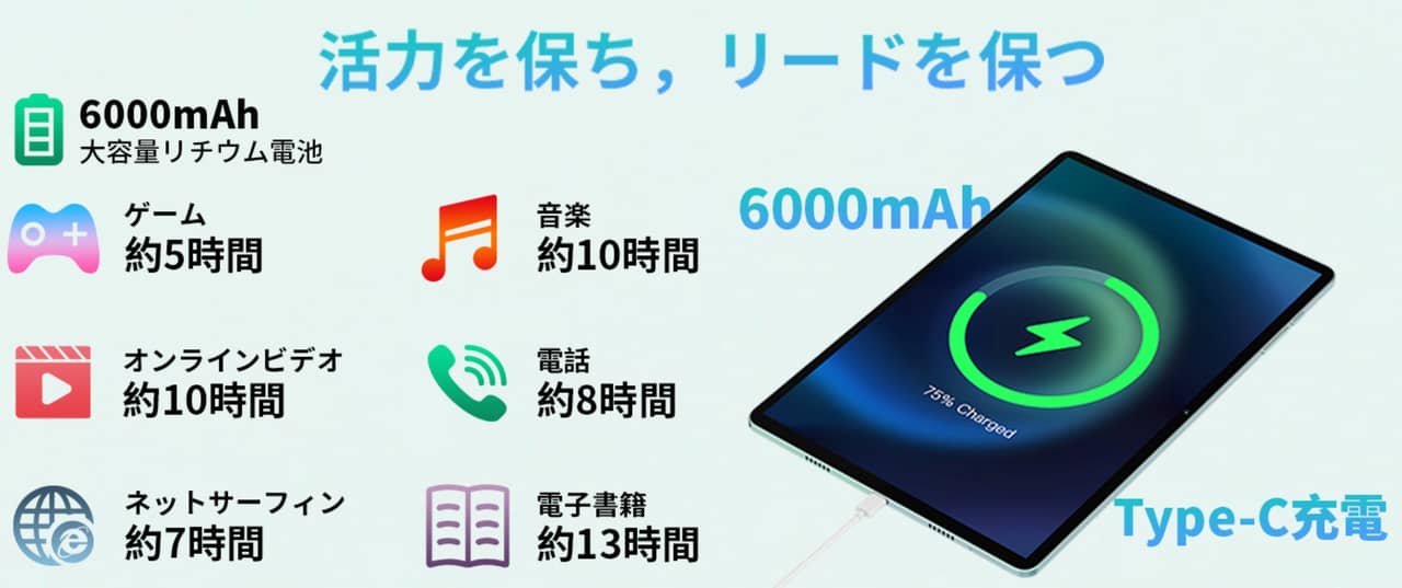 ▼バッテリー容量は6,000mAhと大きめ。オンラインのビデオ視聴は最長で10時間ほど使えるそうで電池持ちはまあまあといった印象です。充電は最大10Wまでと標準的。↓