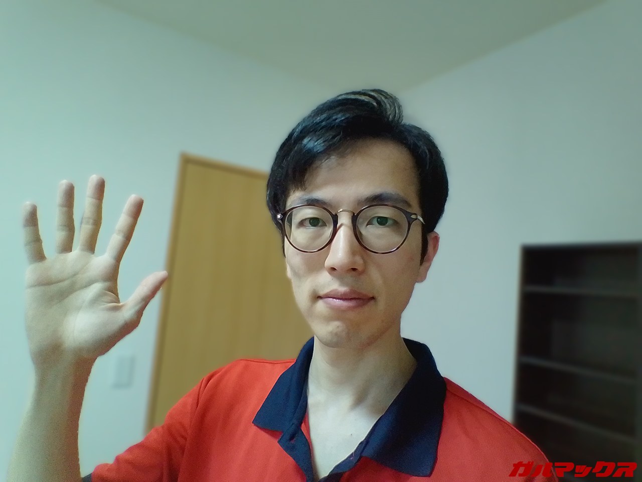 ▼インカメラはこんな感じ。なぜか背面カメラではできなかったポートレート撮影に対応しています。背景はボケるけど、ボケ強度は全体的に弱いです(写真は強度最大)。またこちらもホワイトバランスが弱いようで、蛍光灯下だと黄色っぽい色合いになってしまいます。↓