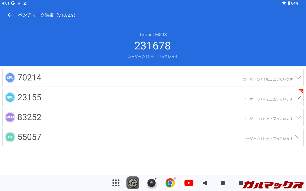 ▼Teclast M50Sの実機AnTuTu(Ver10)スコアは総合が231678点、GPUが23155点。↓