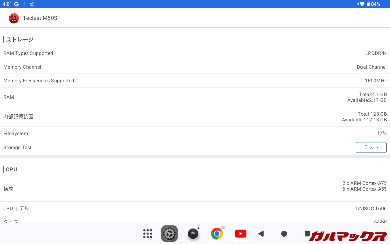 Teclast M50Sの搭載SoCはUNISOC T606。知る人なら知るであろうミドルレンジの底辺クラスのスペックで、普段使いだったら不満なく動かせる、って性能帯。