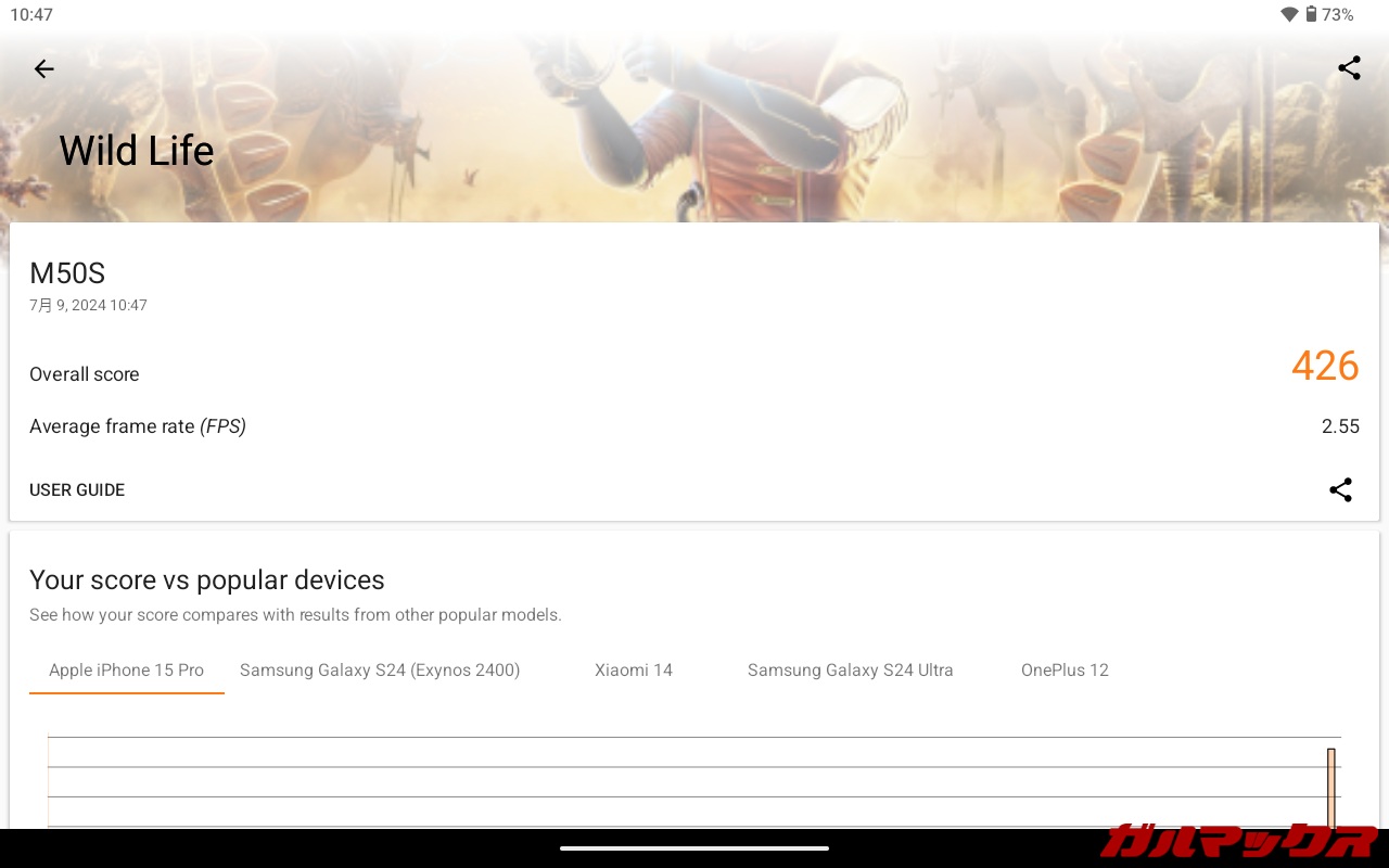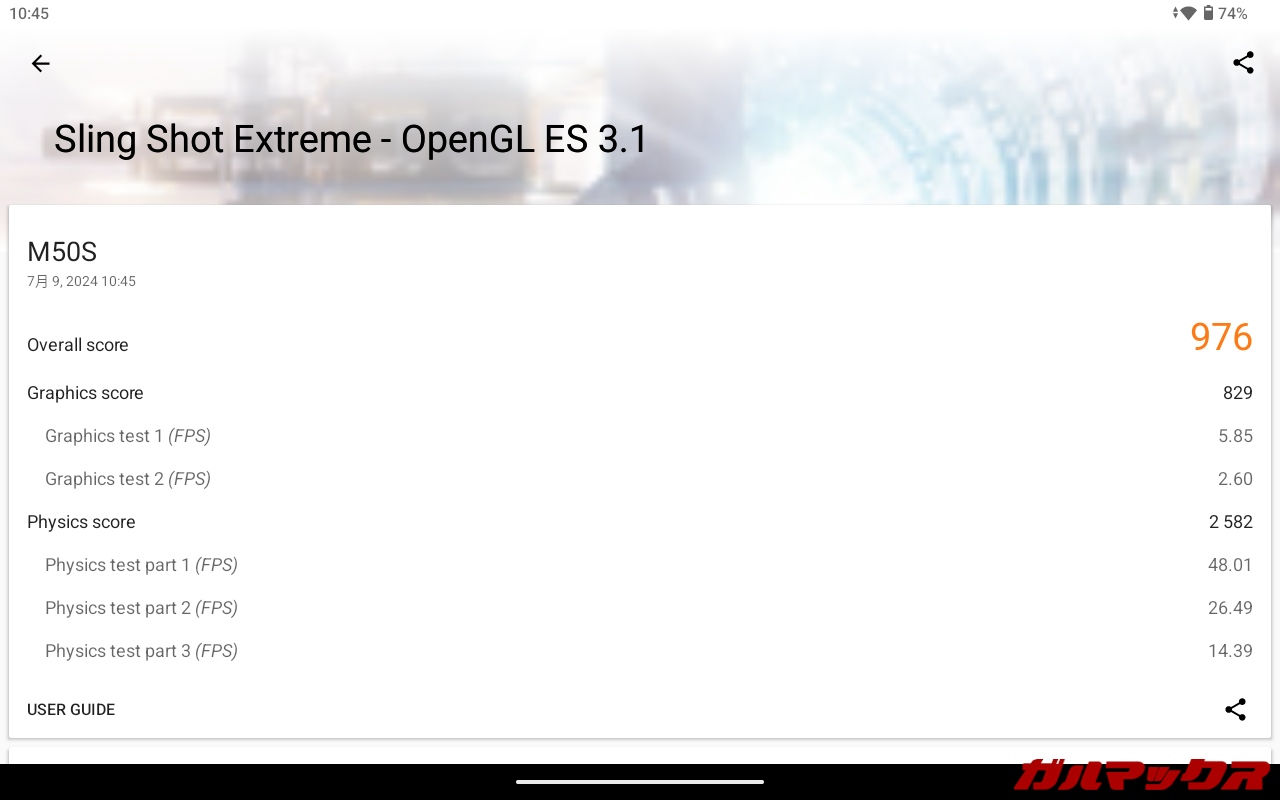 ▼Teclast M50Sの3DMarkはWild Lifeが426点、Sling Shot Extreme OpenGL ES 3.1が976点でした。↓