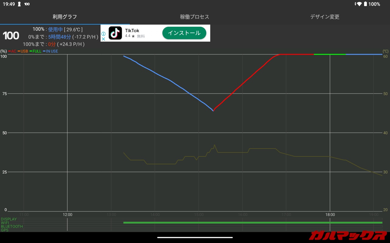 ▼2時間ほどYoutube再生(720p画質)した場合だと100→63%。充電した場合はほぼ同じペースで、2時間ほどで40%というペースになりました。↓