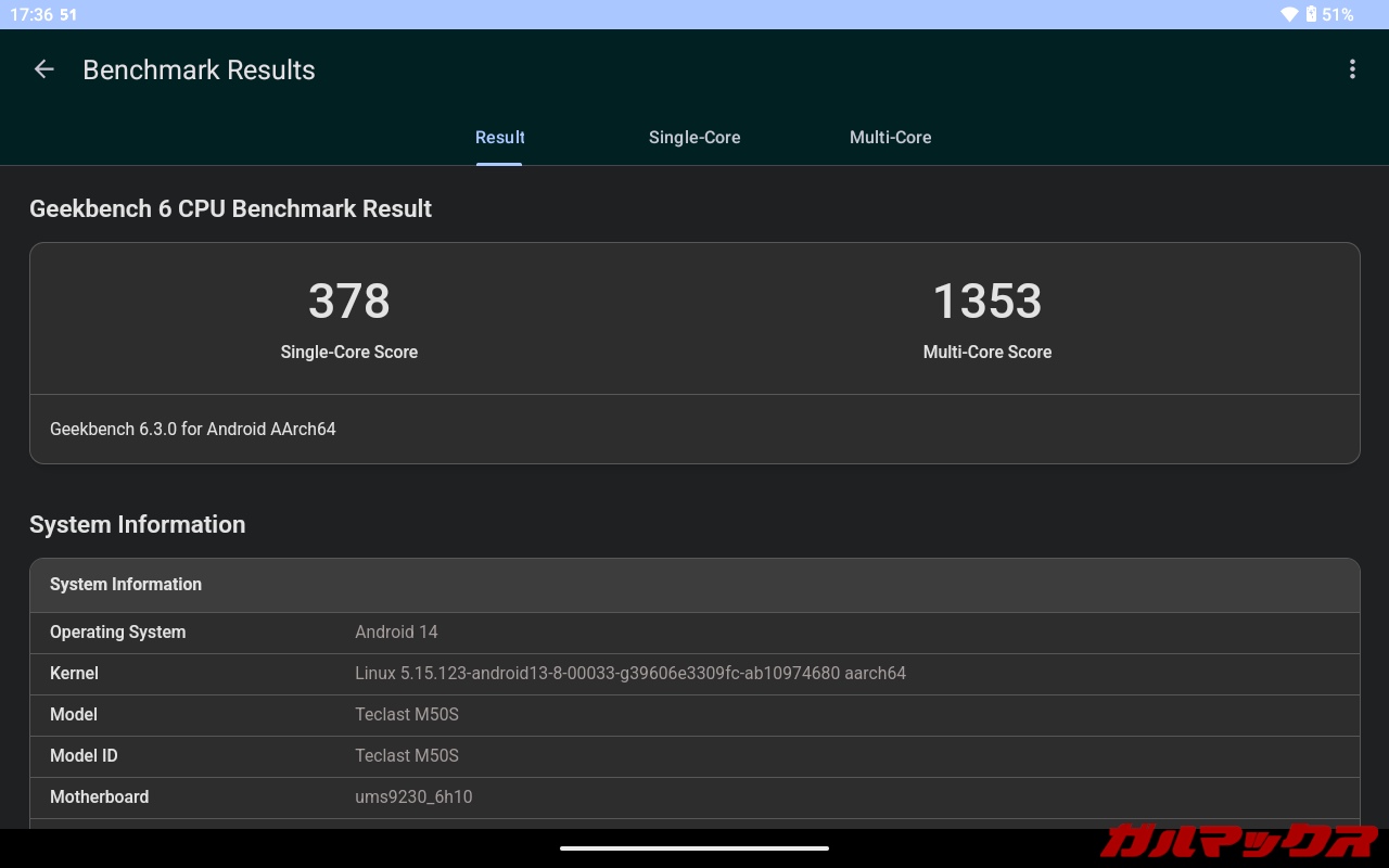 ▼Teclast M50SのGeekbench 6はシングルコアが378点、マルチコアが1353点でした。↓