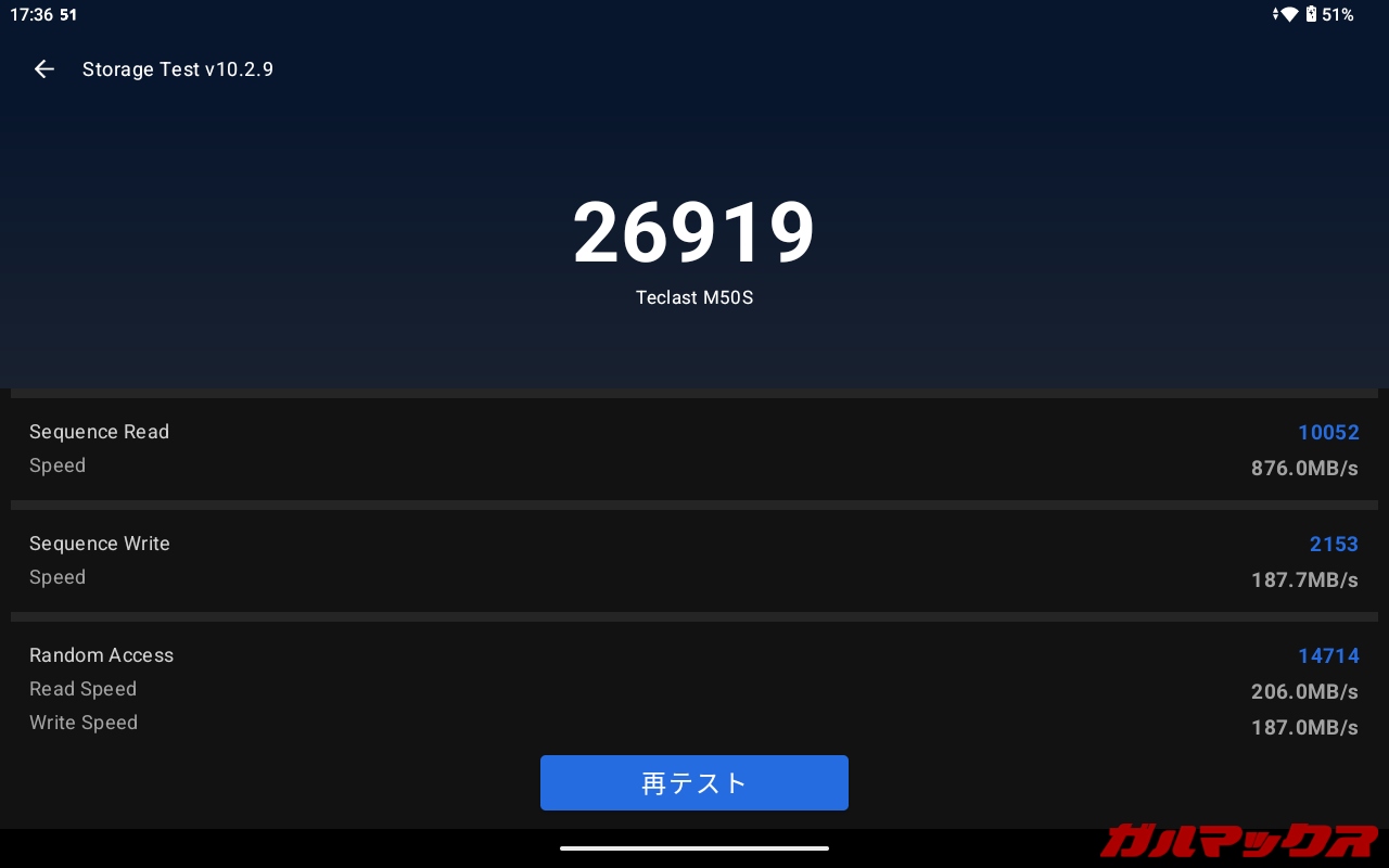 ▼Teclast M50Sのストレージ速度は読み込みが876MB/s、書き込みが187.7MB/s。ランダムアクセスは読み込みが206MB/s、書き込みが187MB/s。↓