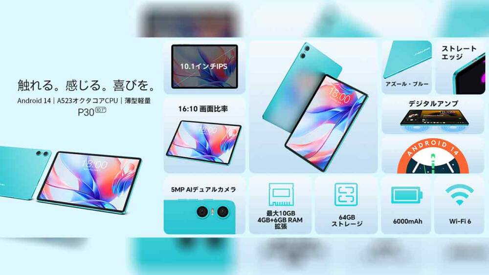 Teclastから登場した新型モデル「Teclast P30」の特徴やスペックをチェックしていきましょう!Allwinner A523搭載エントリーモデルらしい価格の安さ、10型のIPSディスプレイでWidevine L1対応と低価格でコンテンツを楽しめる1台となっとります。