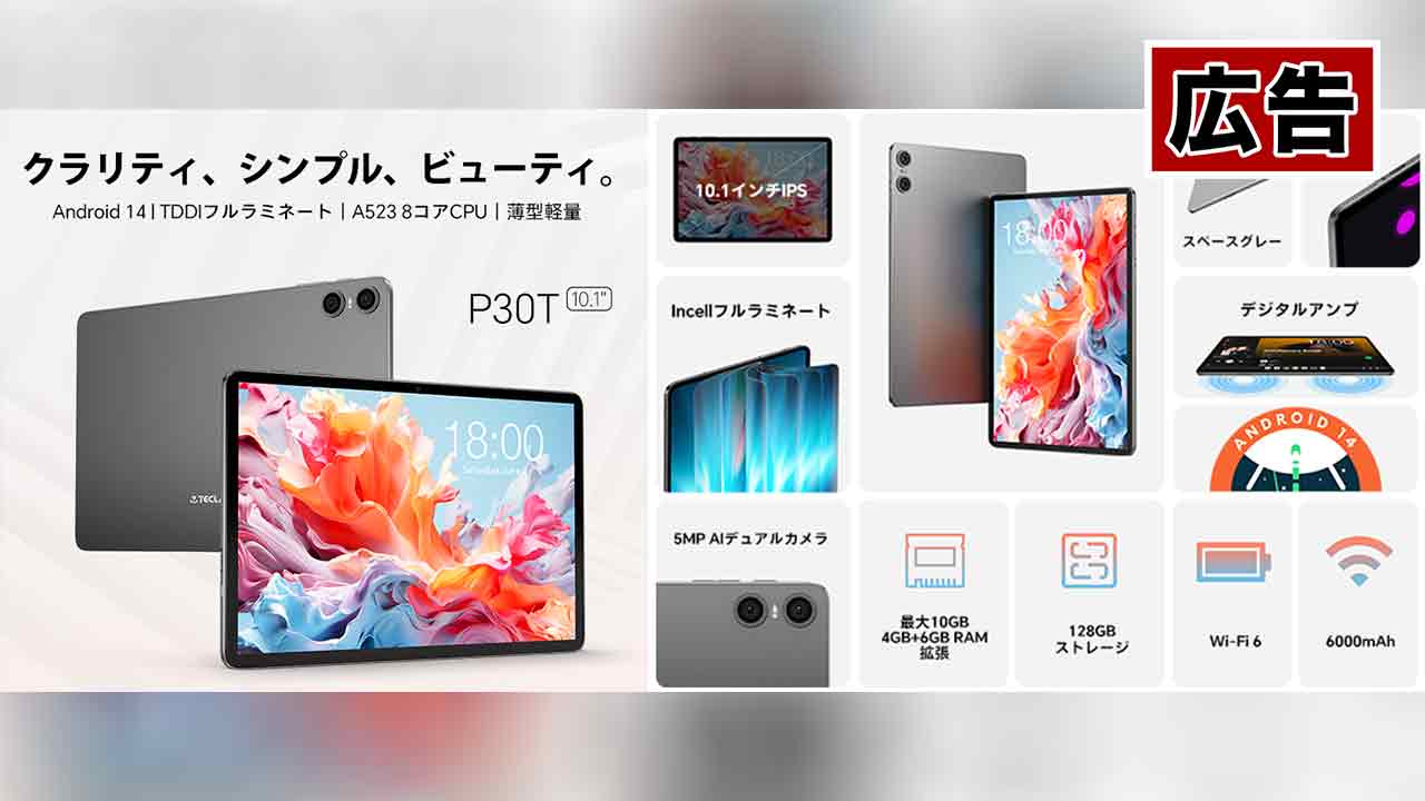 AmazonにてエントリータブレットのTeclast P30Tがセール中。17,900円のところセールで6,000円オフの11,900円とお買い得価格となっています。