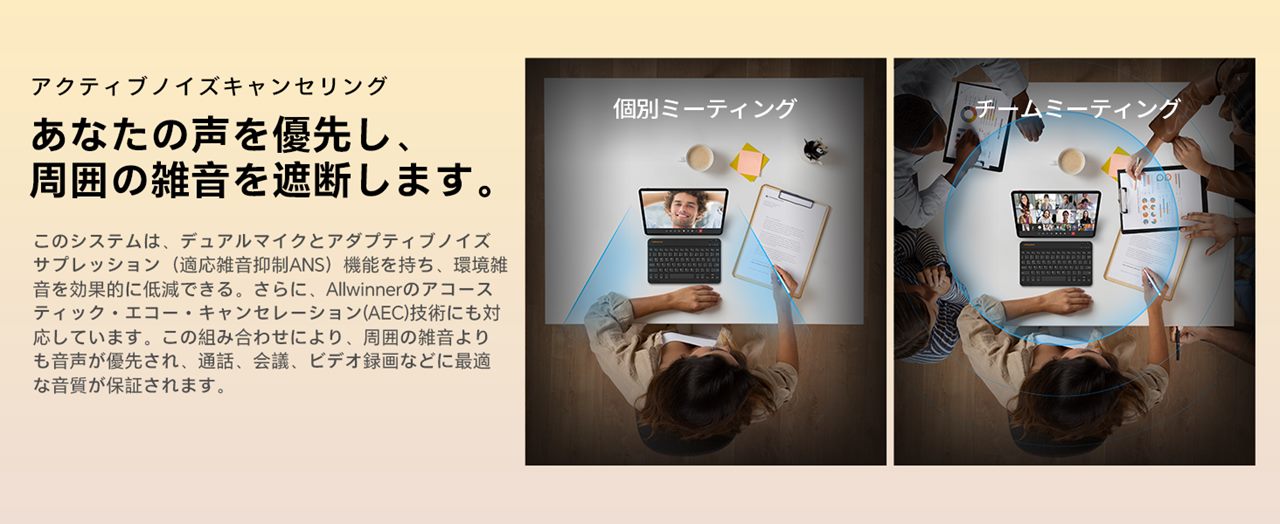 ▼あと1つ変わった特徴としてはノイキャンマイクを搭載だそうです。他の製品であまりこういう部分を推してなかったんですよね。通話するときにしか効果はないんですが、テレワーク用途としてなら良いのかも?↓