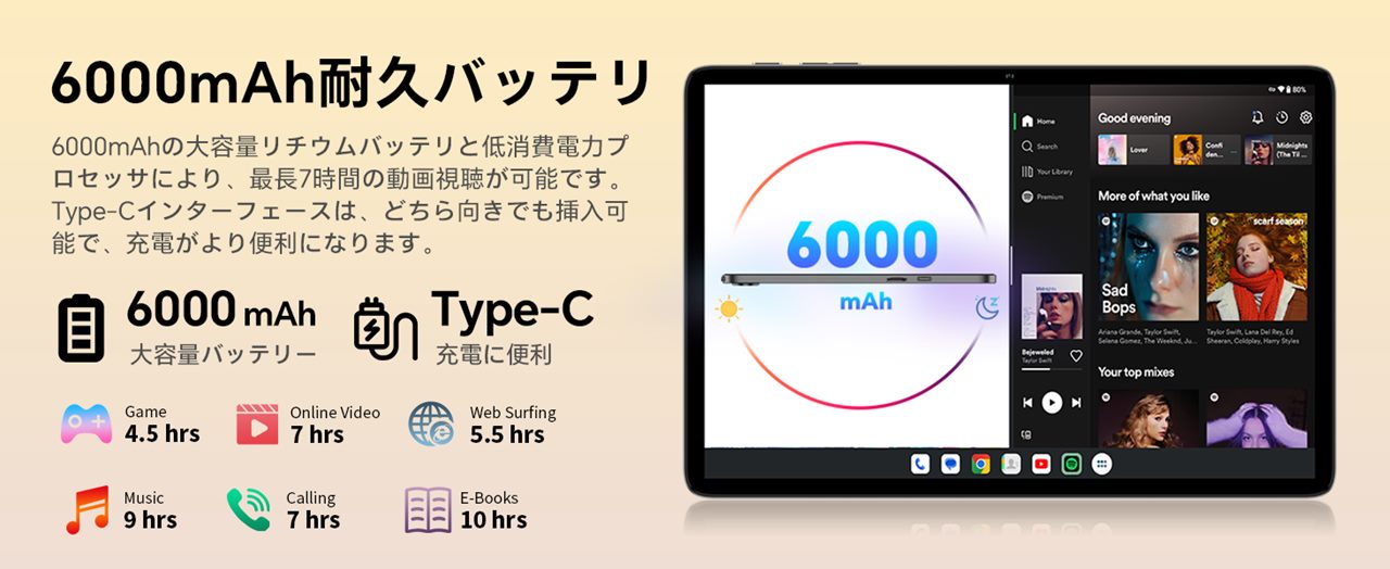 バッテリー容量は6,000mAhと平均より若干小さめですが、オンラインの動画視聴で最長7時間の電池持ちだそうでなかなか電池持ちが悪くはなさそう。
