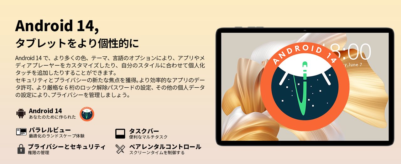 OSはノーマルのAndroidですがバージョンは現行最新の14となっているのがポイント。現時点ではGoogleのPixelやGalaxyのOne UIなどごく一部にしか搭載されてないのですが、エントリーモデルのTeclast P30TでAndroid 14は結構驚きですね(`・ω・´)。