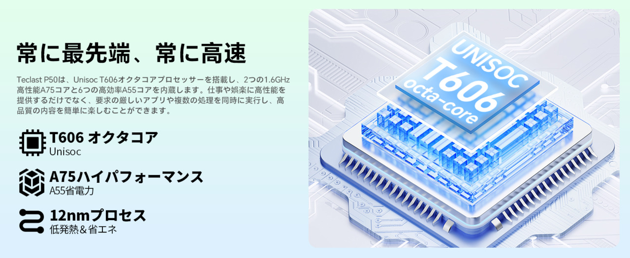 Teclast P50はエントリー帯のUnisoc T606を採用しております。低コスト故に様々なタブレットで搭載されるチップセット。