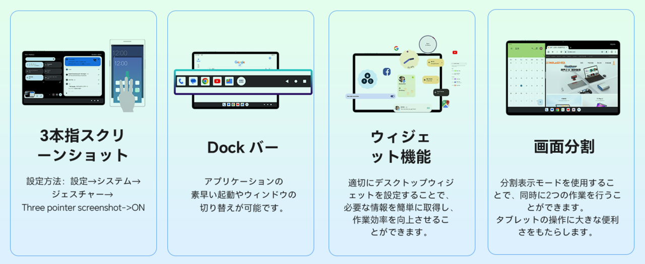 OSは最新バージョンとなるAndroid 14に対応!またTeclastタブレットはドックバー(Windowsでいうタスクバー的なやつ)に対応していたり結構便利機能はあるもんで、使い勝手は期待できそう。