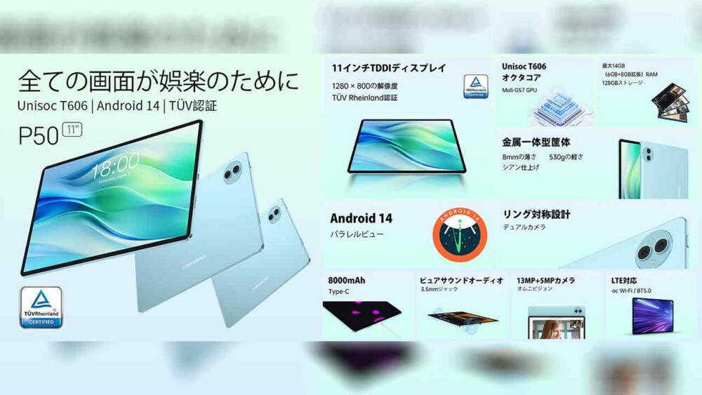 Teclast新型タブレットTeclast P50が登場!11インチのAndroid 14対応セルラータブレットです!特徴とスペック、対応バンドを見ていきましょう。