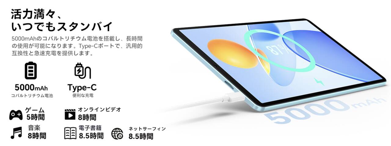 ▼バッテリー容量は5,000mAh。動画、電子書籍、WEBサイトの閲覧などライトな使い方であれば8時間以上は駆動するのでサブ用途で使うなら必要十分でしょう。↓