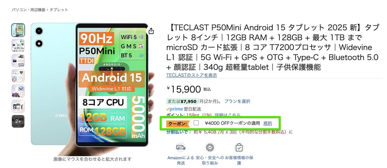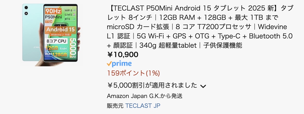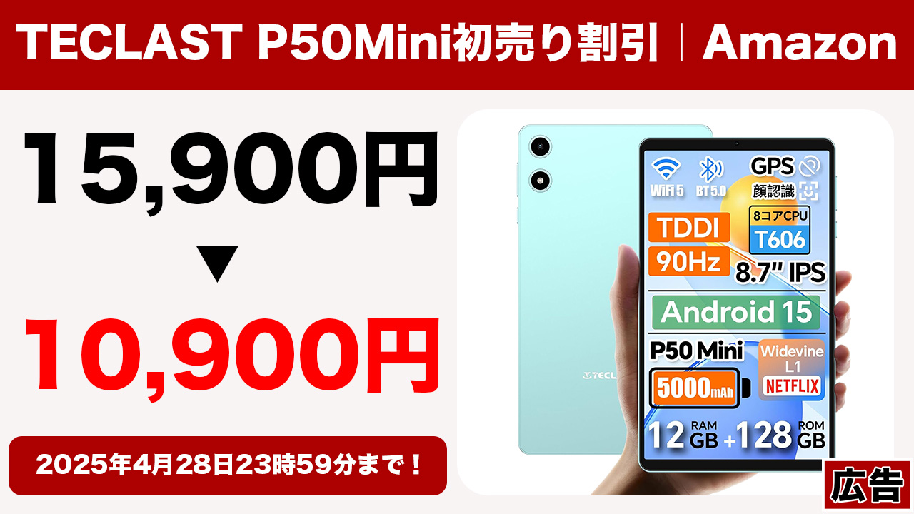 TECLASTが新型の8.7インチタブレット「TECLAST P50Mini」の発売を記念して初売りイベントを開催!通常価格15,900円のところ10,900円に!5,000円オフはデカいですねぇ。割引期間は2025年4月28日までです。