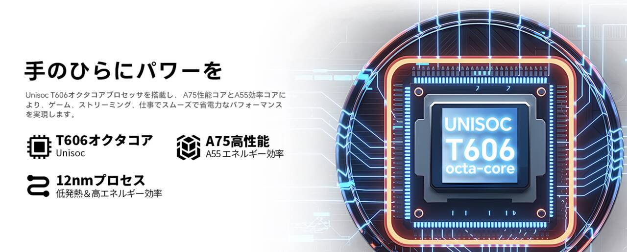 ▼処理性能を左右するSoCはUnisoc T606を搭載しています。(追記:販売ページでリネームとされているT7200の表記に切り替わっています。処理性能は変わりません。)↓