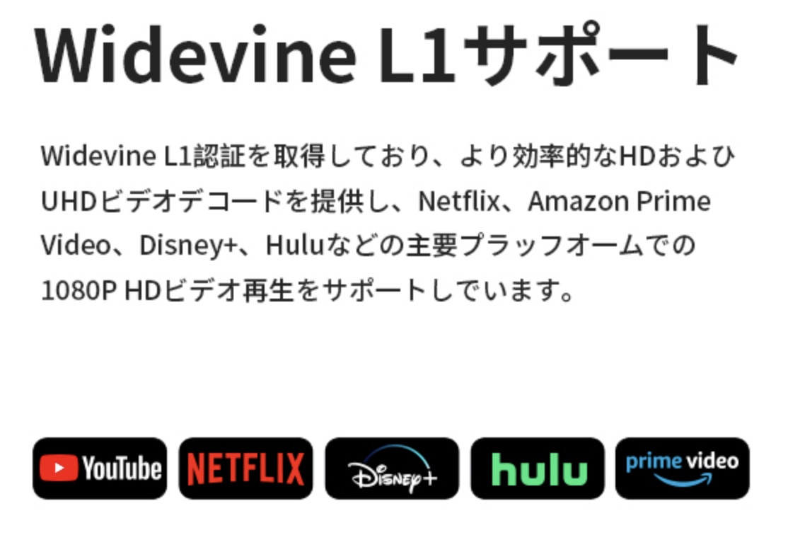 ▼Netflixなど著作権コンテンツを綺麗に再生できるWidevine L1にも対応。↓