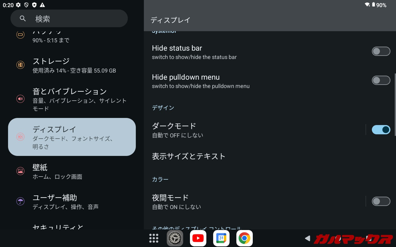 ▼「ステータスバーの非表示」「スワイプダウンで通知メニューを開かない」「横向き画面表示の強制」という設定も可能。ただこれ未翻訳であることからTeclast独自の機能の可能性があります。↓
