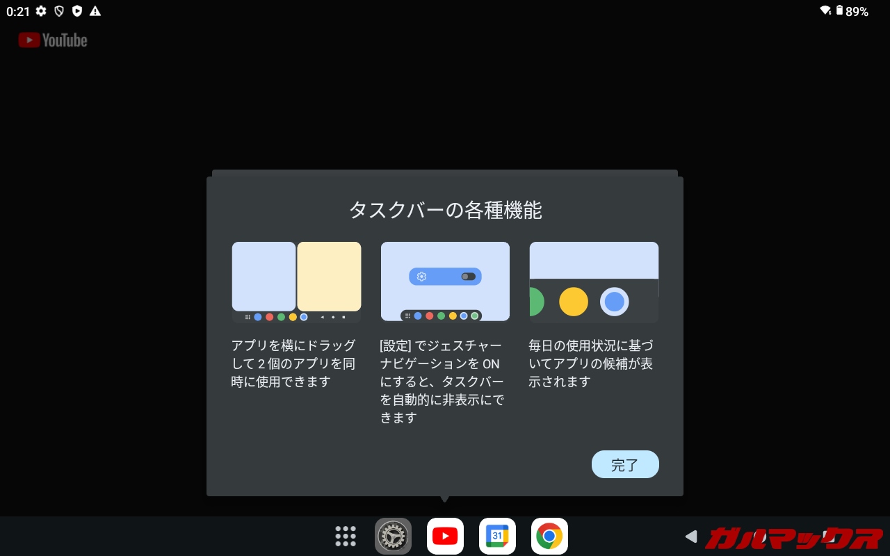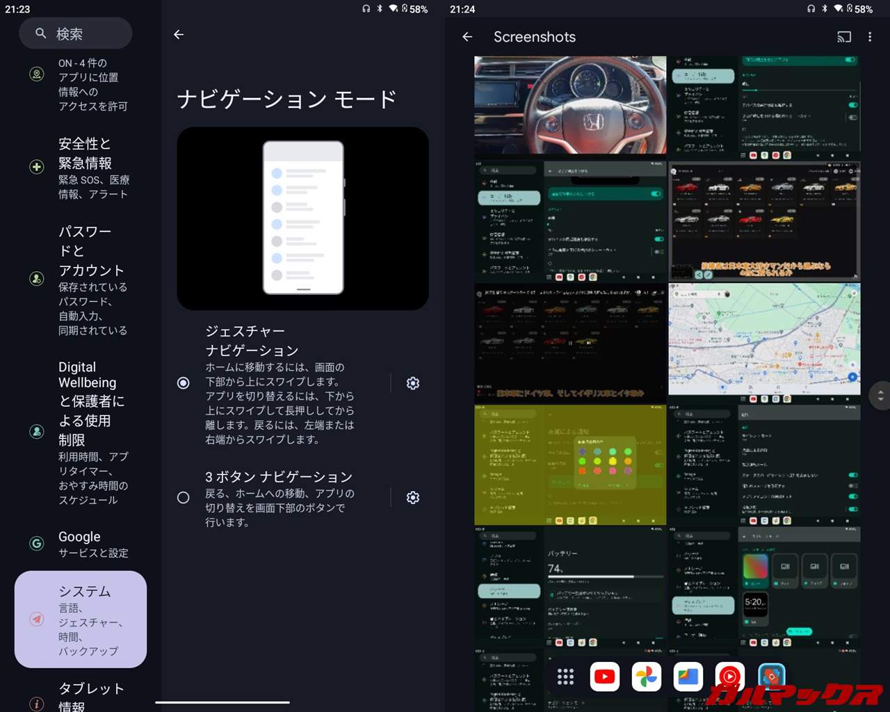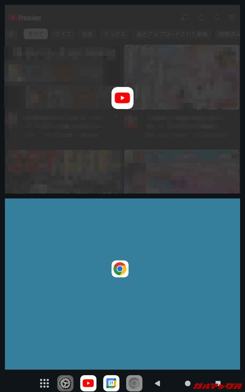 あとタスクバー、なんとジェスチャー式でも出てきてくれます。この下部のバーをゆっくり上に引っ張ることで、設定したアプリが飛び出してくれる。こっちは安定して動きますね。