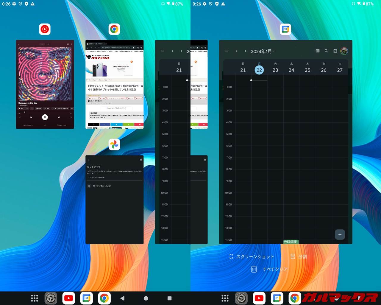 ▼Teclast独自のカスタマイズかは不明ですがアプリ履歴画面も改善されており、直近に開いていたアプリは大画面に、それ以前のアプリはMIUIみたくタイル表示されるようになっています。↓