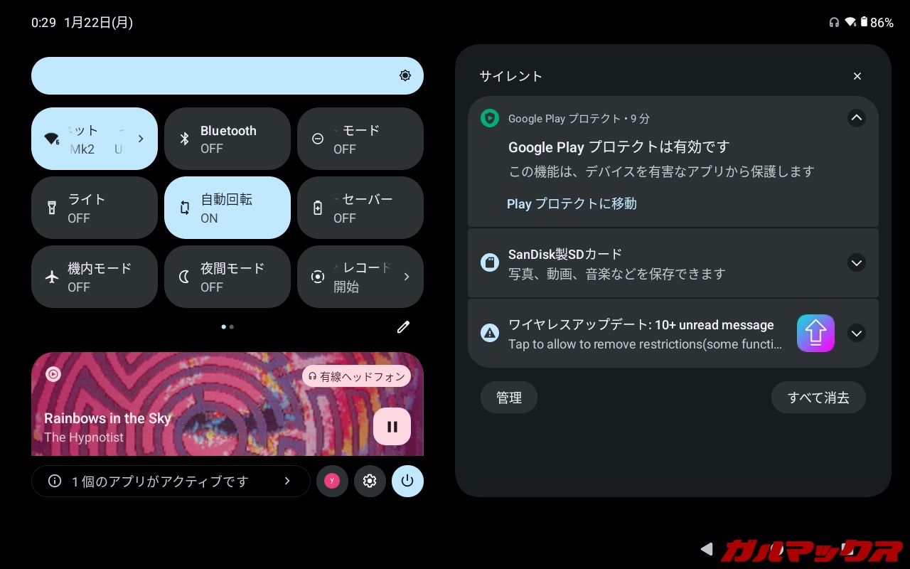 個人的には強制横画面表示が使えるかな?って思ったんだけど、上述したようにスピーカーやイヤホンジャック端子の都合もあるから縦で使うこともあるし、あとアプリによっては固まって死ぬこともあり安定しないので結局オフ。