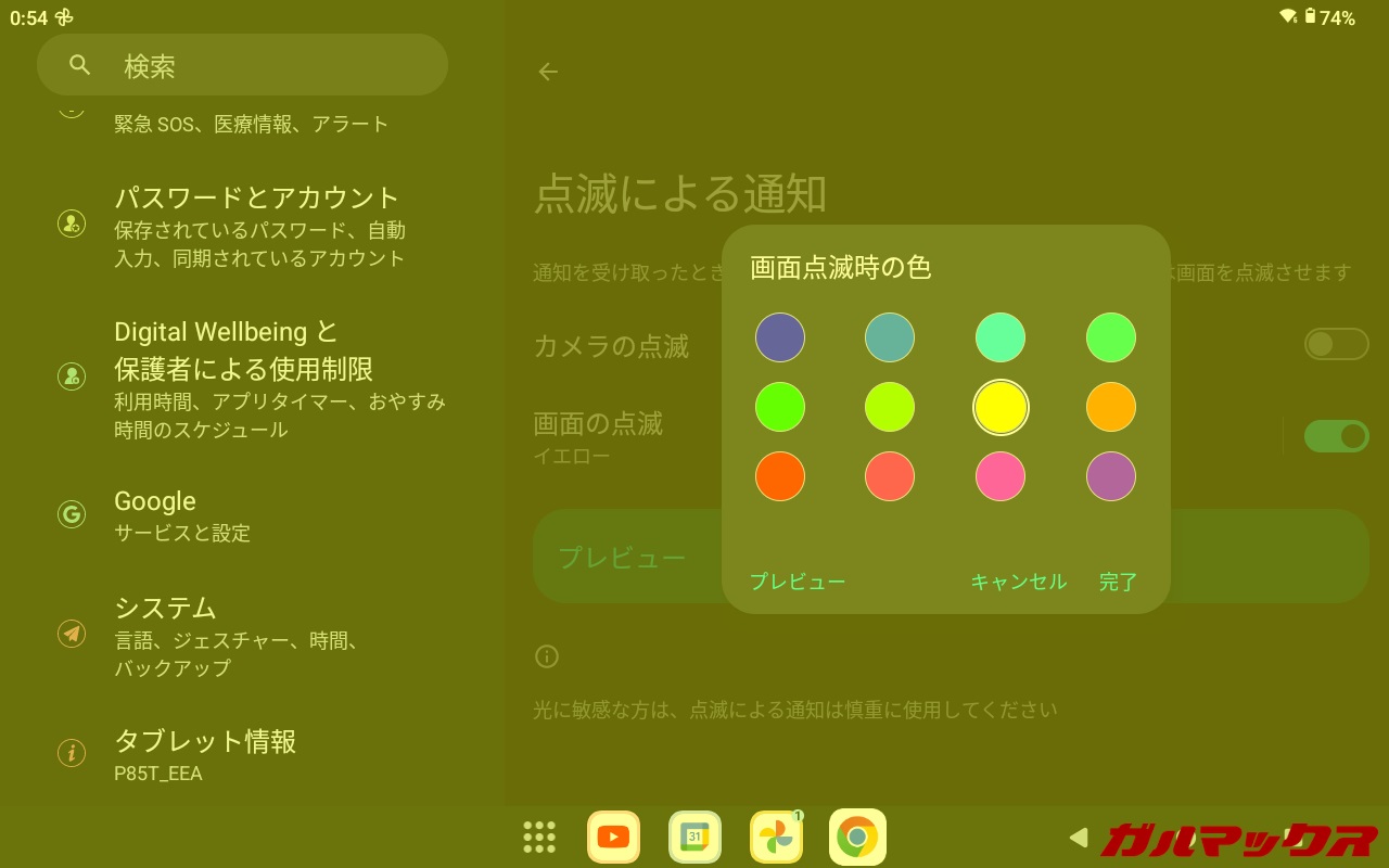 ▼通知受信時は画面を光らせるっていう事ができるようになっています。設定した色、例えば黄色に設定すると、なんかの通知が来たときにこういう感じで黄色で画面が点滅します。↓