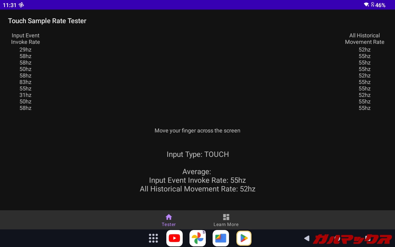 ▼ちなみにリフレッシュレートは60Hzですが、Touch Sample Rate Testerアプリで計測したところタッチレートは52~59Hzと出ました。つまりタッチの追従性は鈍いです。一昔前のカーナビぐらい鈍い。↓